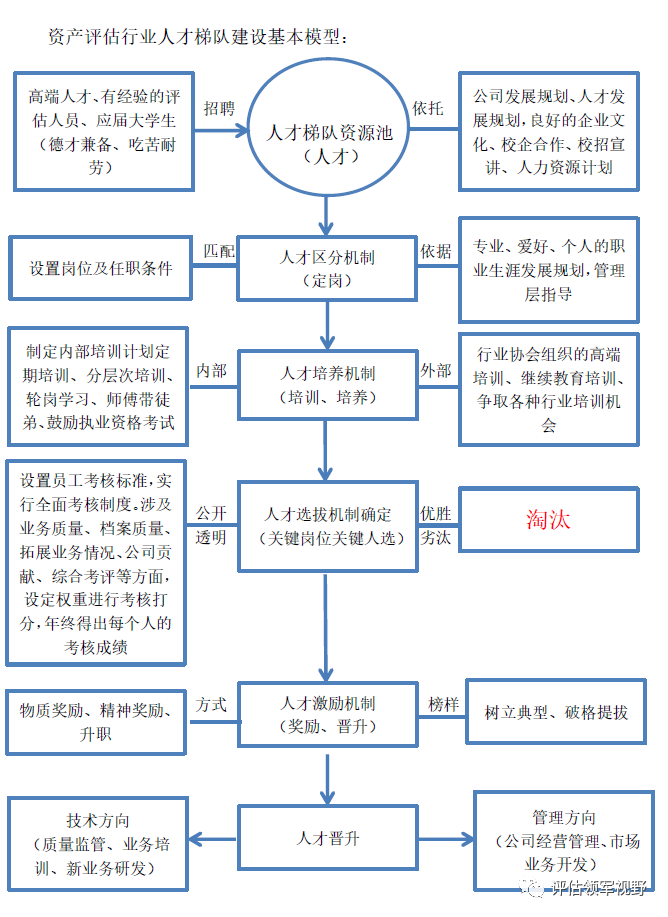 综上,提出评估机构建立和实施人才梯队建设体系的操作方法,如下图。即评估行业的人才梯队建设一定要依托良好的企业文化和企业长远发展规划、适用的人才选聘和培养方式、可行的员工短期中期长期职业生涯规划、科学合理的薪酬体系、公开透明的考核方式、行之有效的晋升激励机制,才能切实有效的发挥它的作用,打造企业自己的人才培养基地。有了强大的人才队伍,才能应对资产评估市场正在发生的深刻变化,增强行业公信力。同时吸引更多具有专业理论知识和执业经验的评估人才加入进来,壮大评估行业人才队伍,改善评估人才结构、增加评估人才储备,形成良好的循环。